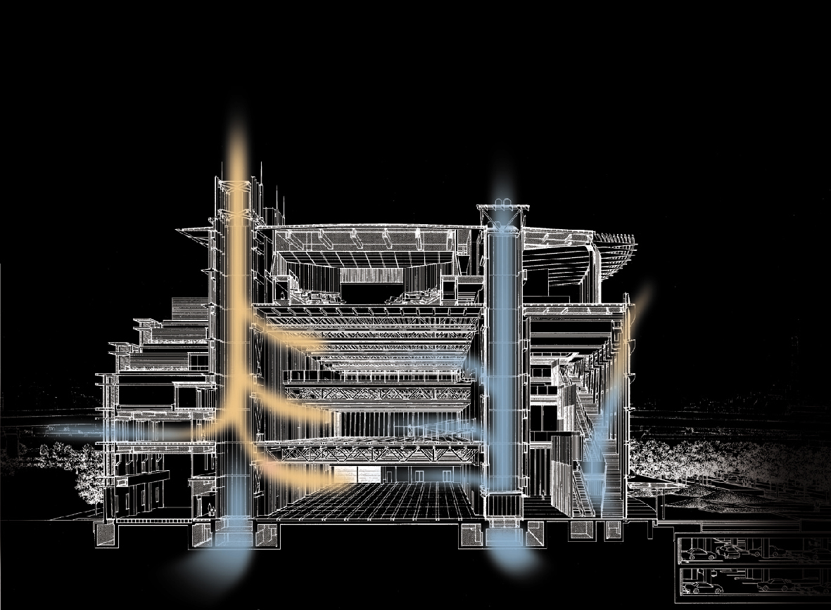 This information center is a comprehensive base for promoting the science and technology of Japan. It is comprised of three zones: an exhibition zone for extensive displays of cutting-edge scientific technology, a research zone which houses cutting-edge scientific research, and a communication zone to facilitate interaction between visitors and researchers. Ten “towers” have also been positioned inside the building, bringing lots of natural light all the way into the expansive structure and creating an airy atmosphere.