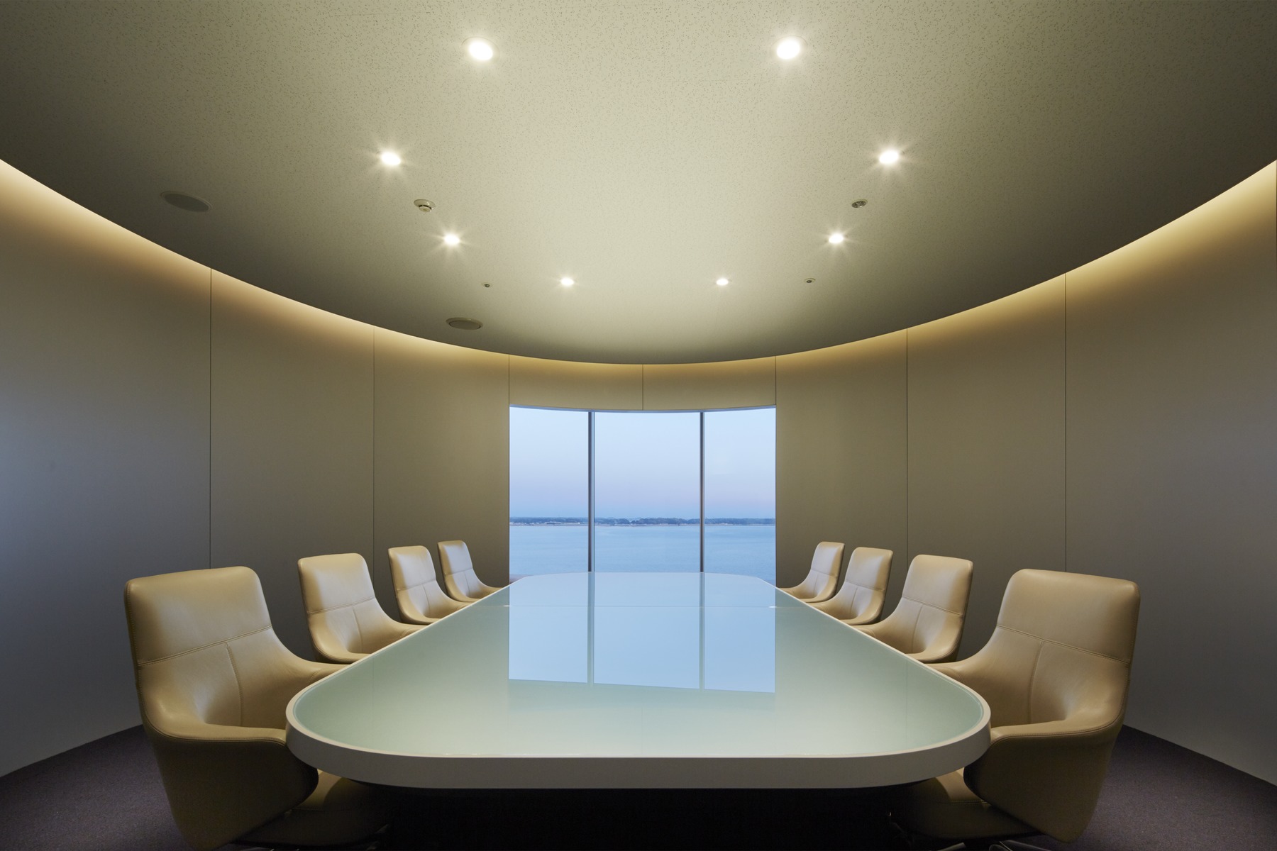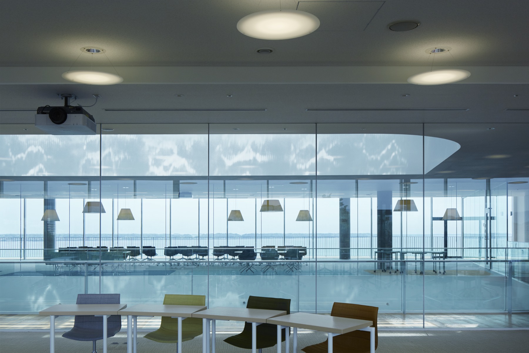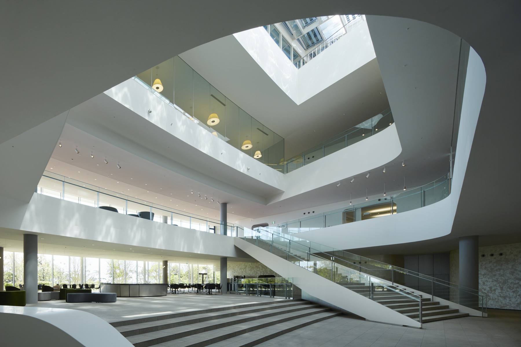 This training center sits atop a small hill about 40 meters from a lake. On weekends it is also used as a recreation facility for employees and their families. The design aimed to create a building that leads visitors toward “new value creation,” with sleek streamlined exterior that fits in with the hilly terrain, and a wide variety of indoor spaces that blend with the scenery.