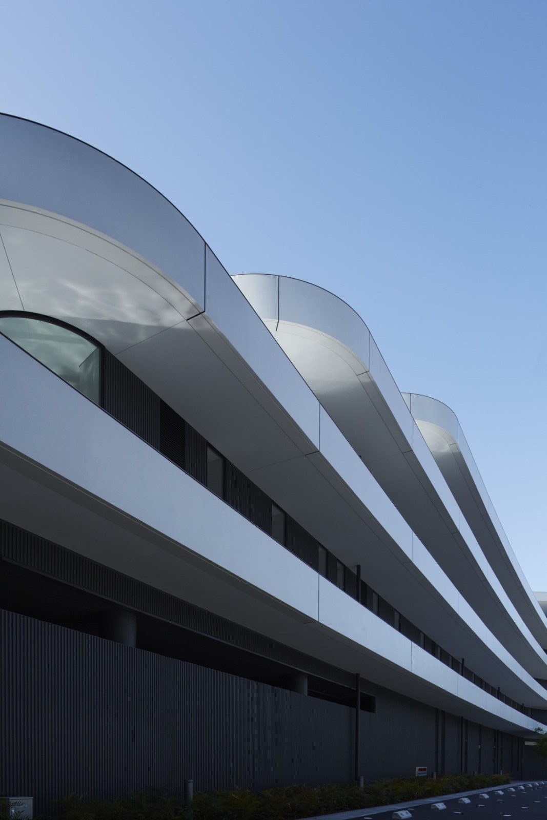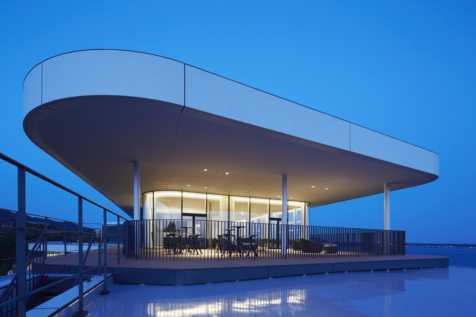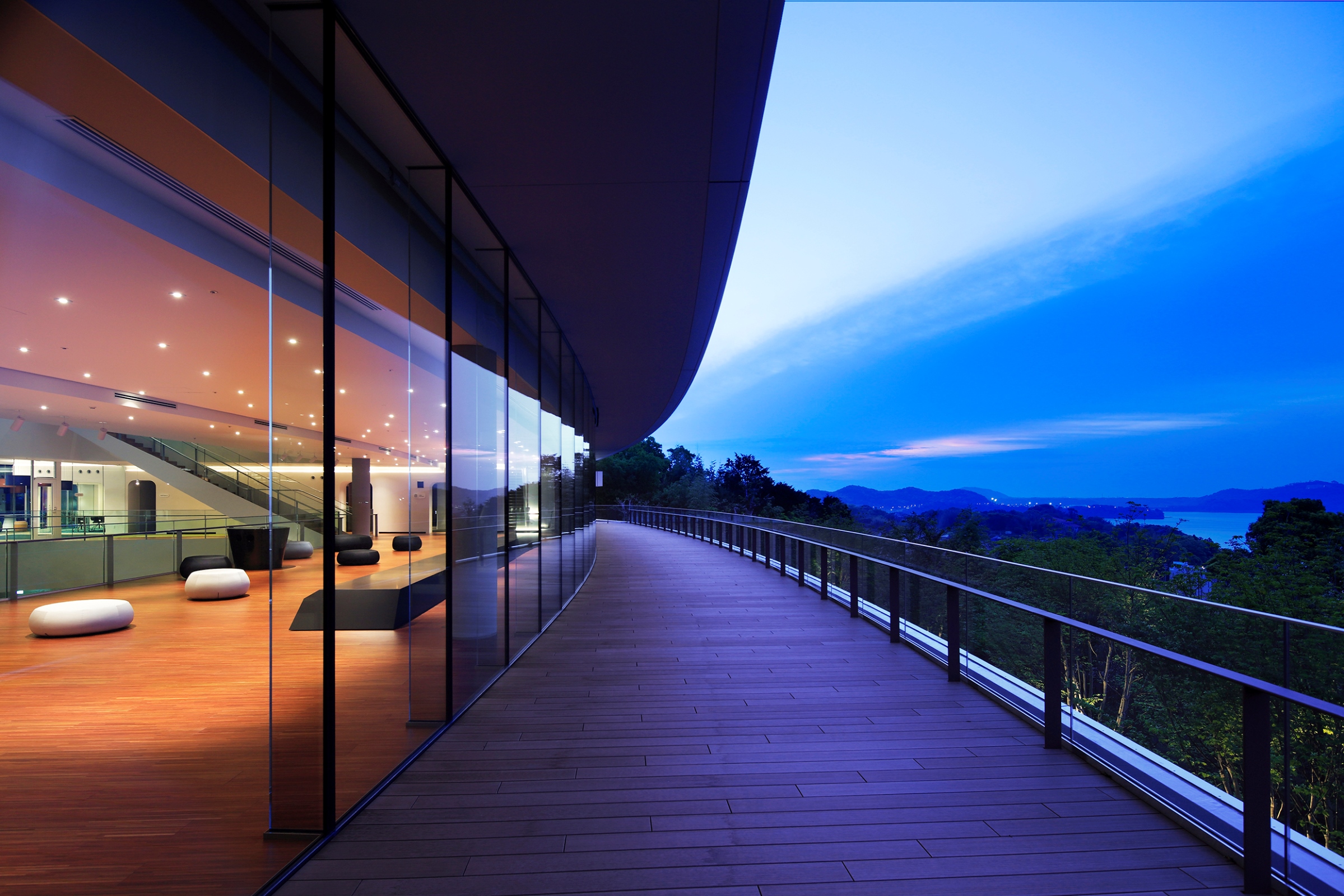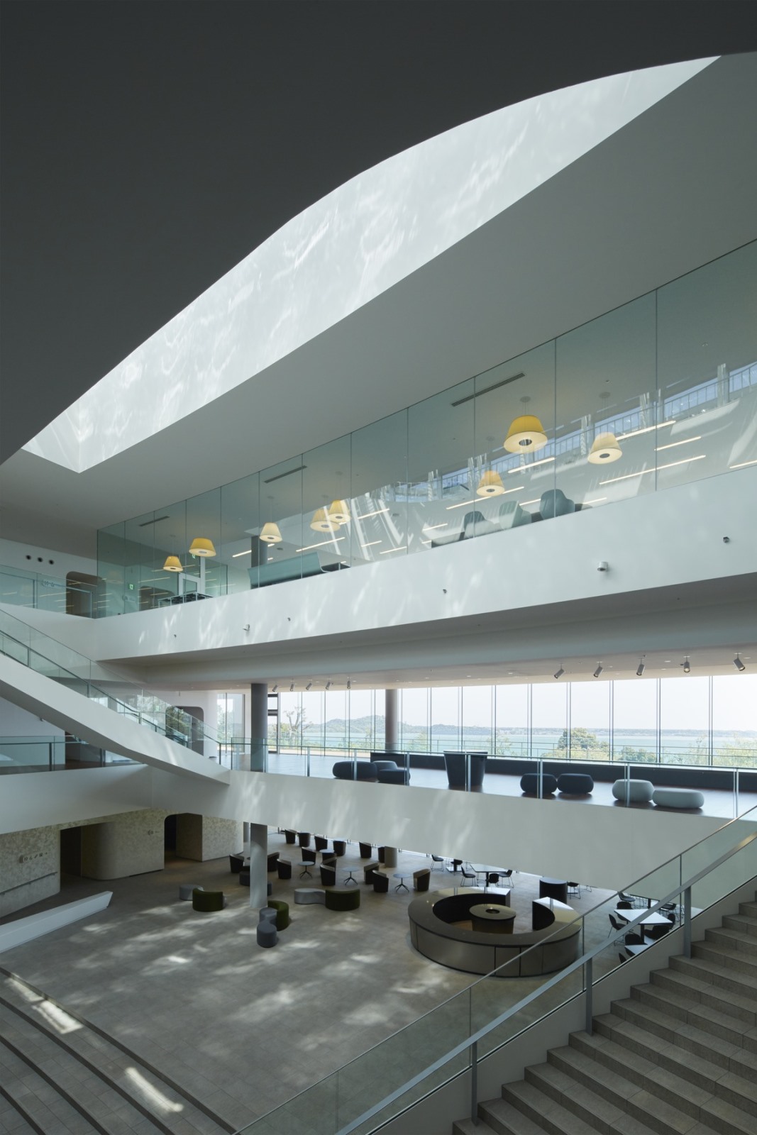 This training center sits atop a small hill about 40 meters from a lake. On weekends it is also used as a recreation facility for employees and their families. The design aimed to create a building that leads visitors toward “new value creation,” with sleek streamlined exterior that fits in with the hilly terrain, and a wide variety of indoor spaces that blend with the scenery.